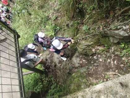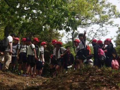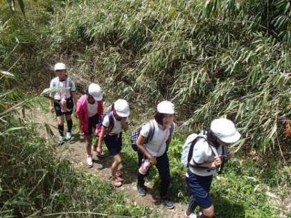 池田城の見学の後は、いよいよ五月山をのぼり始めました。坂道を歩いたり、綱を使って登ったりと児童は一歩一歩地面をしっかり踏みしめて歩きました。