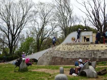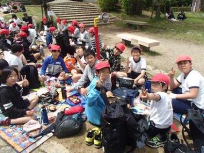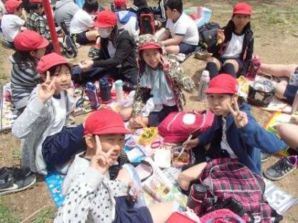 広場についてみんな待ちに待った昼食時間。友だちと一緒にお弁当を食べました。もちろんお弁当の後はお菓子も食べました。