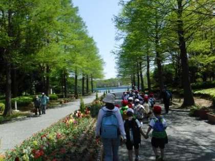 今日は1・2年生が長居公園へ遠足に行きました。今週は遠足週間です。どの学年も雨に降られずに遠足へ行くことができました。晴天のしたで、1・2年生は先生の注意を聞いて安全に長居公園へ行きました。