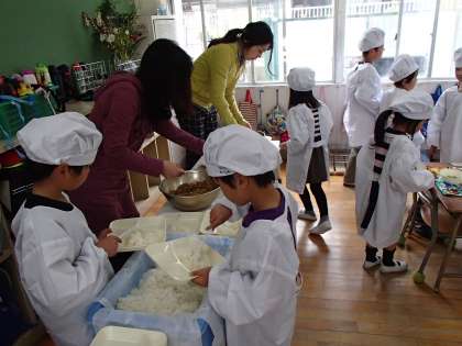 下段:給食を前にして児童はO先生の話をきちんと聞いています。「はい、先生」と質問にしっかり手をあげて答えていました。