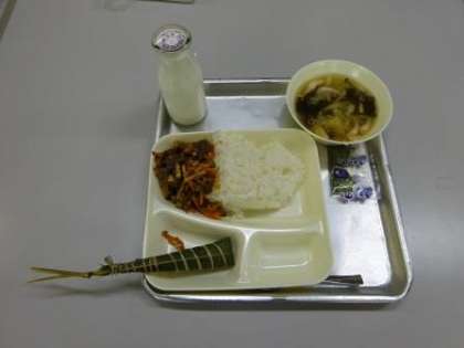今日の給食はこどもの日の行事献立です。牛肉のちらしずし・すまし汁・ちまき・きざみのり・米飯・牛乳です。給食では時々、行事や季節に応じた献立になります。今日もこどもの日にちなんでちらしずしやちまきが出ました。ちまきは既製品を出されたものではなく、きちんと学校で蒸したものを児童に提供しています。