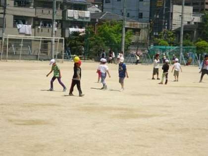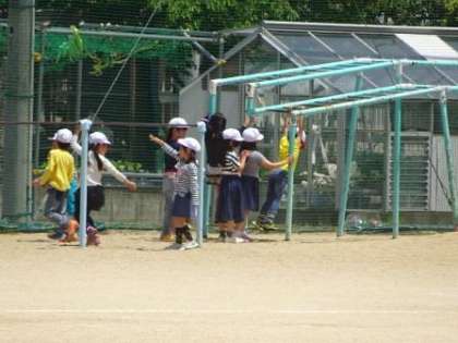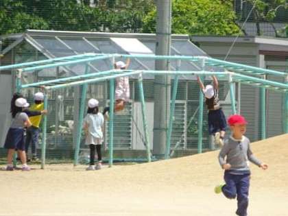 運動場の真ん中ではボール遊びをしていました。また、うんていや鉄棒で遊んでいる児童もいました。
