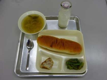 今日の給食はカツオのガーリックマヨネーズ焼き、スープ、グリーンアスパラガスのソテー・レーズンパン・牛乳です。ガーリックマヨネーズ焼きと聞いて、食べた後の匂いが!と思うかもしれませんが、にんにくはひとり0.3g程度で食べた後でも匂いはあまり気になりませんでした。逆にカツオの臭みがなくなり、食べやすい児童好みの味になっていました。