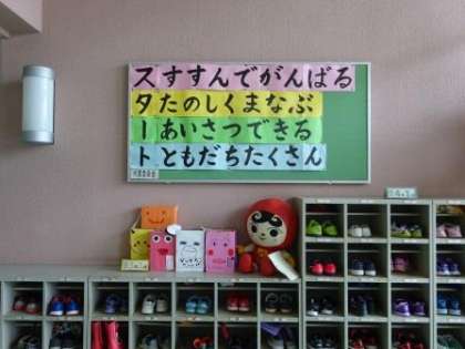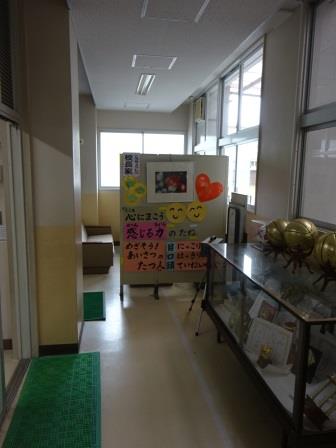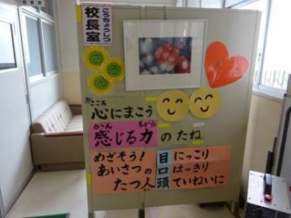 校長先生は朝会の時に大きな文字を見せて低学年でも話の内容がよくわかるように説明しています。以前、始業式の時の「スタート」や全校朝会の「感じる力」「あいさつ」などホームページで紹介しましたが、それらの講和の時にも使って児童にわかりやすく話をしていました。使いました大きな文字は、今校長室の前にあるついたてに掲示しています。