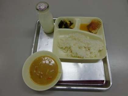 今日の給食は赤魚のしょうゆだれかけ・みそ汁・わかたけ煮・米飯・牛乳です。みそ汁の中には、うすあげ・豚肉・にんじん、たまねぎ、キャベツ、もやし、けずりぶしだし、白みそ、赤みそが入っています。うすあげは湯をかけて油抜きを前もってしているので、児童にとって高すぎず、昼食の適切なカロリー量になっています。