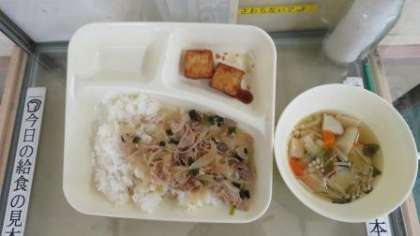 今日の給食は豚丼・五目汁・あつあげのしょうがじょうゆかけ・米飯・牛乳です。今日は給食室にある見本を写真に載せました。おおよそ児童が食べる一人前の分量を給食室にある見本棚に置いています。児童は給食を取りに来た時に、食器に入れるおかずの場所や入れる量を見本で確認しています。