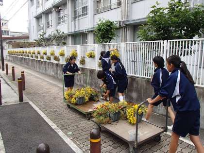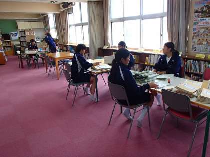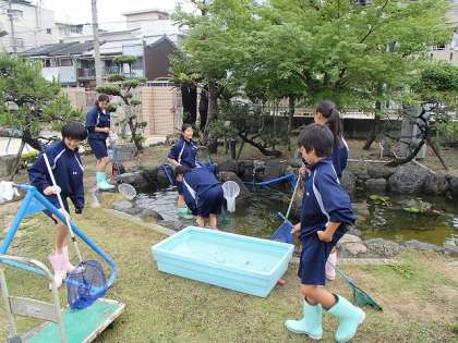 今日は、午前中、管理作業員さんの指導のもと、池の掃除とハンギング洗いと設置、5時間目は、図書室などの整備を行いました。給食時間や昼休みは、クラスに入って過ごしました。
