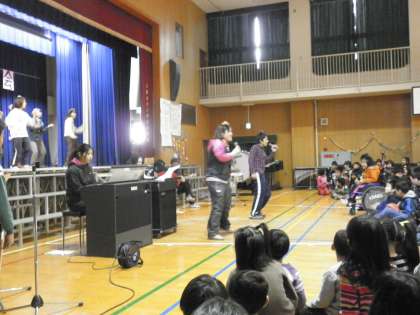 卒業まで残りわずかな日数となった3月6日、講堂で全学年の児童が集まり、「卒業を祝う会」を催しました。1〜5年は合奏や演奏で6年生を祝い、また記念のプレゼントも手渡しました。6年からも卒業の記念品も各学年と職員室に送りました。