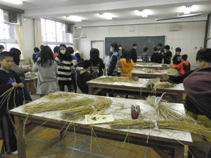 5年生は、稲の『体験学習』の仕上げとして『わらじ作り』にチャレンジしています。