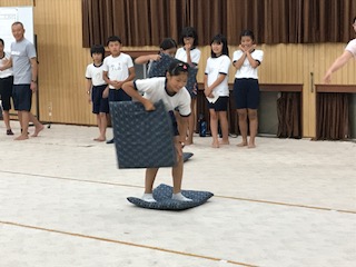 雨のため、キャンプファイヤーから室内オリンピックへ。100メートル走、槍投げ、相撲など、バラエティ豊かな競技内容でした。