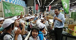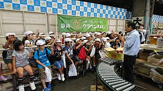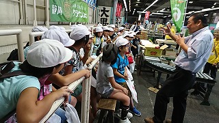 市場につくとまず、実際に果物のセリを見学し、セリの体験をしました。