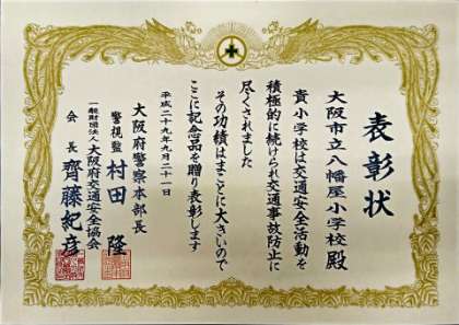 これは、本校の取り組みだけでなく、保護者や地域のみなさまの交通安全指導が評価されてのものです。今後ともよろしくお願いいたします。