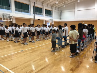 はじめに、お互いの校歌を歌って交流しました。観音寺小学校の校歌は、練習していって、八幡屋小学校はハーモニーパートを歌いました。」