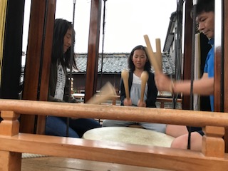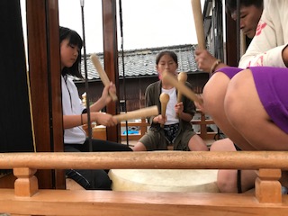 「ちょうさ祭りの準備をしている上若町会の人達のご好意で、ちょうさに乗せていただいたり、太鼓の叩き方を教えてもらったり、秋祭りの雰囲気たっぷり味わいました。」