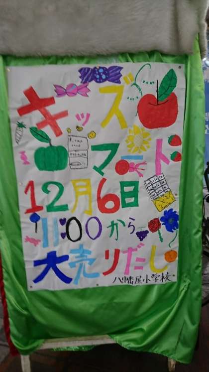 キッズマートは12月6日(水)商店街のロータリーで、11時から12時ごろまで、売り切れ次第終了します。野菜、果物、お花、お菓子を販売します。ぜひ、お越しください!