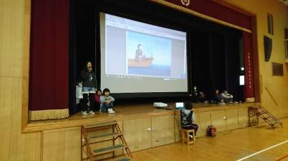 絵本をプロジェクターで投影し、読み聞かせをしました。題材は「浦島太郎」でしたが、とても雰囲気のある美しい絵本で、図書委員会の子どもたちも、落ち着いてしっとりと読むことができていました。