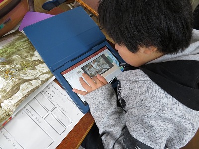 読んだ本の紹介をしあう、というめあてで、本時は、タブレットを使ったプレゼンテーションを作っていました。