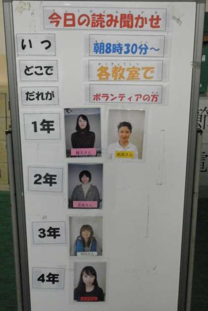 今年も5月から毎週金曜日の朝、ボランティアの皆さんによる読み聞かせをしています。今日は1〜4年の教室に5人の方が入られました。朝、写真入りの掲示板を玄関に置いて、児童に読み聞かせをしていただく方を知らせています。読み聞かせのボランティアに参加していただける方がいらしたら教頭までご連絡ください。
