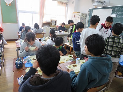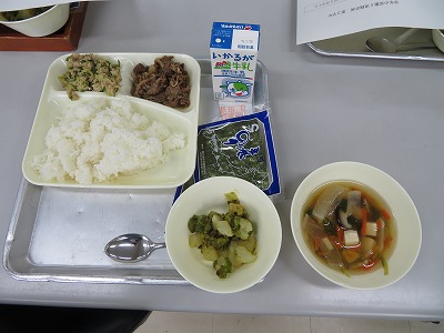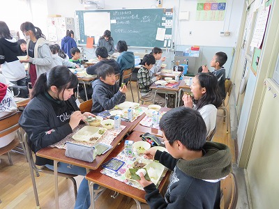 メニューは、手巻きごはん(牛肉の甘辛煮 ツナソテー)、すましじる、わなしのまっちゃクランブルでした。子どもたちは、自分で巻いて、おいしそうに食べていました。