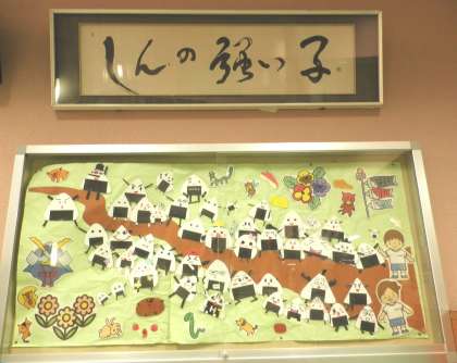 校訓の「しんの強い子」の下には、月ごとの掲示があります。5月は遠足の弁当なのか、おにぎりです。