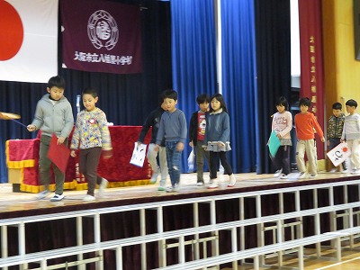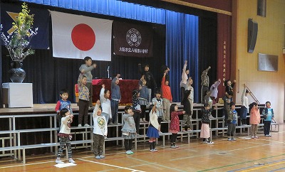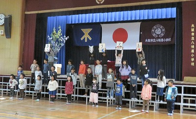 6年生が卒業したあとの講堂では、1年生が入学式での歓迎の演技の練習をしています。