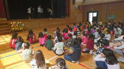 見本は先生たちが。うまくできると子どもたちから拍手が起きました。