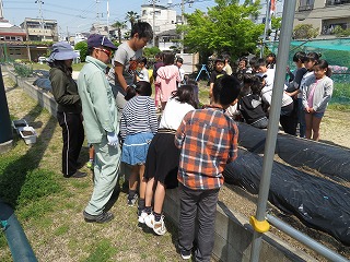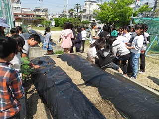 5年生は、今日、カボチャとインゲンマメを植えました。