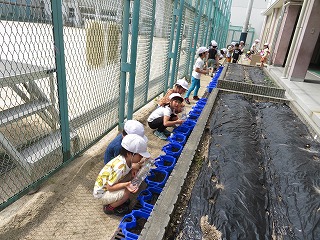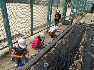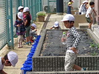1年生は、休み時間に、先日植えた朝顔に水をあげていました。