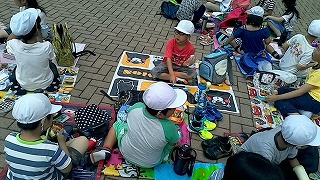 お弁当はサンタマリア号の見えるところで食べました。みんなで、サンタマリア号に手をふりました。