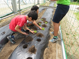(上)5年生がかぼちゃの苗を植えている、5月17日の様子です。こんなに小さい苗が…