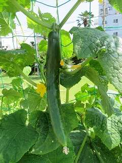 なかよし学級のきゅうりです。病気になりかけていましたが、畑にネギを植えることで、こんなに立派な実をつけられるくらい、元気になりました。