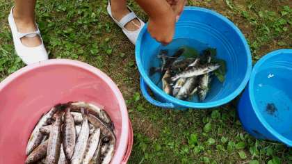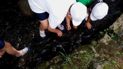 宿舎横の小川に歓声が響きます。子どもも魚も必死です。