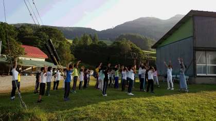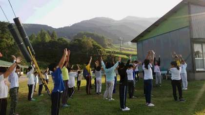 高原の朝をつげる鳥の声で目が覚めました。今日もよい天気です。みんなそろって元気に朝の体操をしました。