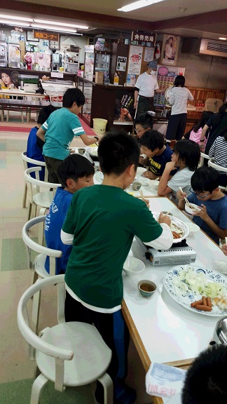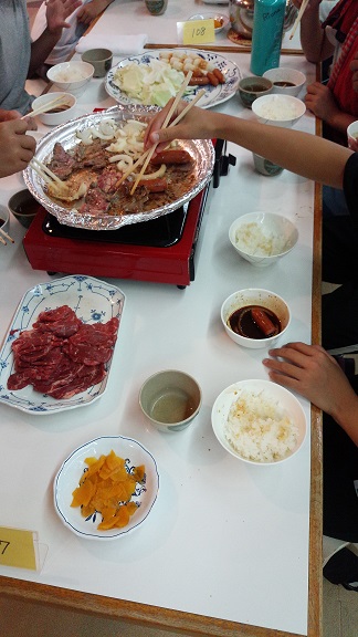 今夜は焼肉です。みんなで協力して焼きました。今日一日、しっかり活動したのでおなかもペコペコです。万両さんの焼肉はおいしいので、どんどん箸が進みました。
