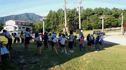 ラジオ体操の様子と食事係が食事の準備をしているところです。