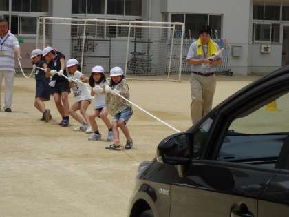 4時間目は、運動場で本物のクルマを使った実験をしました。クルマと綱引きしたり、エンジンを見たり、クルマに乗せてもらったりしました。クルマに触れて、パワーをコントロールすることの大切さを学びました。