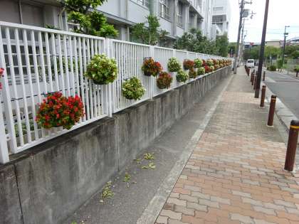 7月に3年生の児童が植栽活動で植えた花が大きくなりました。残念なことに、せっかく育てた花が一部引き抜かれていました。それでもほかの鉢では赤や白の花を大きく咲かせて、学校の周りを華やかにしています。また、通行人の方々の目を和やかにしてくれていることでしょう。秋には3年生が別の花に植え替えて、一年中花を絶やさない学校にする予定です。
