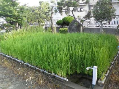 上:5年生の「田んぼ」、5月の田植えからここまで大きくなりました。あとは「チュンチュン攻撃(スズメの食害)」からどう守るかにかかっています!