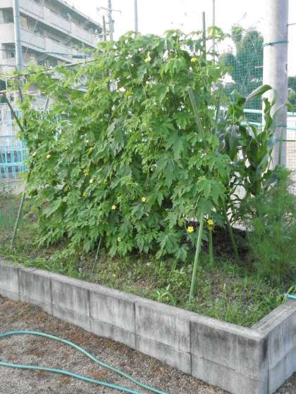中:こちらは「飼育栽培委員会」の「ゴーヤ」と「とうもろこし」、「とうもろこし」は、すくすくと成長し先端に「花穂」が出始めました♪
