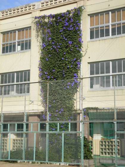 下:西校舎壁面の「グリーンカーテン」、琉球アサガオが見事に咲きほこっています。ご存知でしたか?琉球アサガオの花は日中は「青色」、夕方は「紫色」に変わります。理由は、花びらに含まれる色素のためです♪(へぇーなるほどね!)