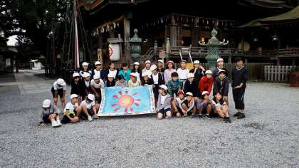 朝食前に全員で金毘羅さんへ登って記念写真をとりました。