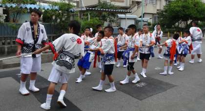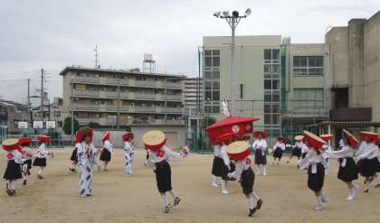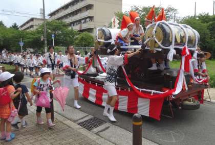 山車(だし)は、学校の正門前まで来て、太鼓を叩いてくれました。踊り子は校庭の中で踊ってくれました。