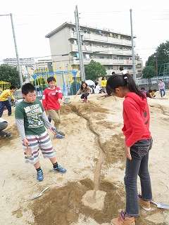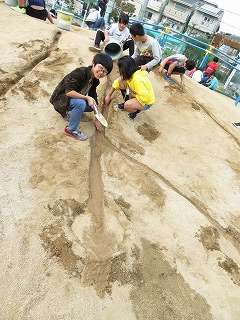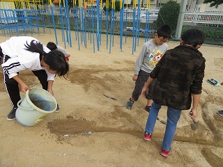 運動場のあしの盛り土を山に見立てて、班ごとに川をつくり、水をながしました。