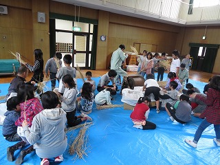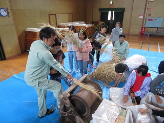 管理作業員さんに手伝ってもらって、子どもたちもしっかり働きました。このあと、「もみすり」「精米」をして、調理実習でいただく予定です。楽しみですね。