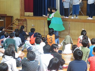 今日の児童集会は「もの当てゲーム」でした。カーテンの間を飛んでいるものを当てます。