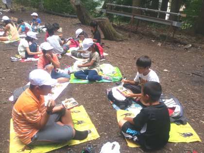中段:校長先生と子どもたちが森に行き、カブト虫のエサをしかけに行きました。