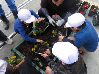 3年生で植栽活動を行いました。八幡屋公園事務所と地域の方々にご協力いただき、黄色と紫色のビオラを植えました。