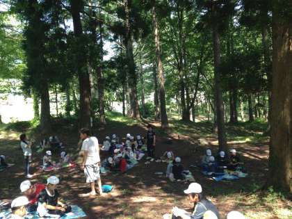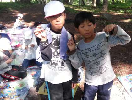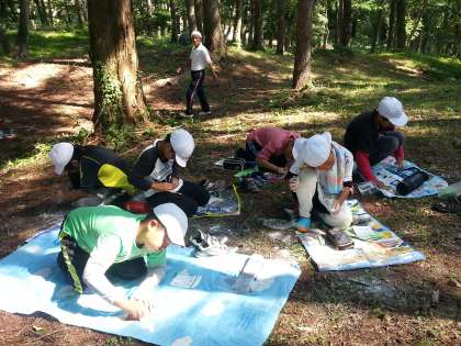 「ヤハタヤの森」の中で、みんな熱心に削り、勾玉を完成させました。