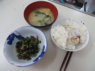 5年生が田植え、稲刈り、脱穀をしたお米と、八幡屋農園で収穫した大根をみそ汁に使いました。