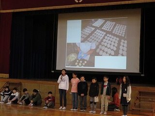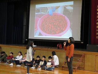 この日から給食週間が始まるということで、児童集会の時間帯に給食委員会からの発表がありました。